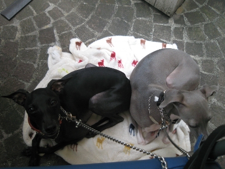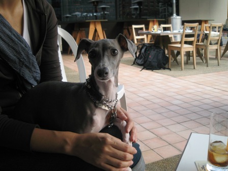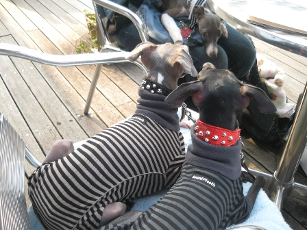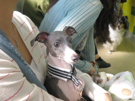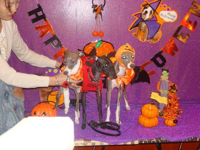 今日は、白金のバーガーマニアでランチ。人間8人+イタグレ9頭。 普通にOFF会並ですが、3頭連れ1家族と2頭連れ2家族と・・・あとは1頭連れx2なだけでそんな状態。 悲しいかな、そんなに集まるなんて聞いてなくってカメラ忘れた。 だって近所にちょっとランチしに行く感覚だったの。 モナに似てるドルチェちゃんとかブルーノくんに似てるAたんとかに会えたのに~。 カメラ、持ってくればよかった・・・・。 と、気を取り直して、、、、散歩しようと十番まで行って茶をしてたら、、、 ハロウィンの撮影してます~よかったらどうですか?と声をかけられてみたら、 偶然、ライアンと志保さんとぱぱさんが撮影してるのを発見したっ!!!! というわけで、お願いしました~。 カメラマンが撮った写真は11月にCDロムに焼いてくれるらしい~。 志保さんが撮ってくれた写真イタダキマシタ! パンプキン帽子も悪魔ちゃんスーツも自前ではなく、借り物ですぅ~☆