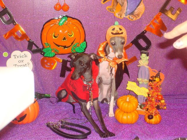 今日は、白金のバーガーマニアでランチ。人間8人+イタグレ9頭。 普通にOFF会並ですが、3頭連れ1家族と2頭連れ2家族と・・・あとは1頭連れx2なだけでそんな状態。 悲しいかな、そんなに集まるなんて聞いてなくってカメラ忘れた。 だって近所にちょっとランチしに行く感覚だったの。 モナに似てるドルチェちゃんとかブルーノくんに似てるAたんとかに会えたのに~。 カメラ、持ってくればよかった・・・・。 と、気を取り直して、、、、散歩しようと十番まで行って茶をしてたら、、、 ハロウィンの撮影してます~よかったらどうですか?と声をかけられてみたら、 偶然、ライアンと志保さんとぱぱさんが撮影してるのを発見したっ!!!! というわけで、お願いしました~。 カメラマンが撮った写真は11月にCDロムに焼いてくれるらしい~。 志保さんが撮ってくれた写真イタダキマシタ! パンプキン帽子も悪魔ちゃんスーツも自前ではなく、借り物ですぅ~☆